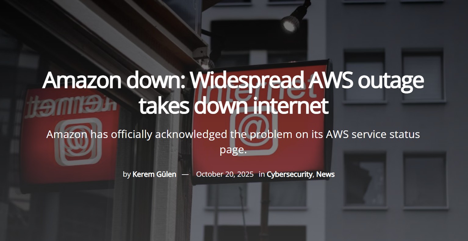 關於2025年10月20日全球亞馬遜公告提出,亞馬遜網路服務 (AWS) 發生重大故障,導致大規模網路中斷,數十款熱門應用程式、遊戲和網站癱瘓,其中包括 Snapchat、Roblox、Fortn